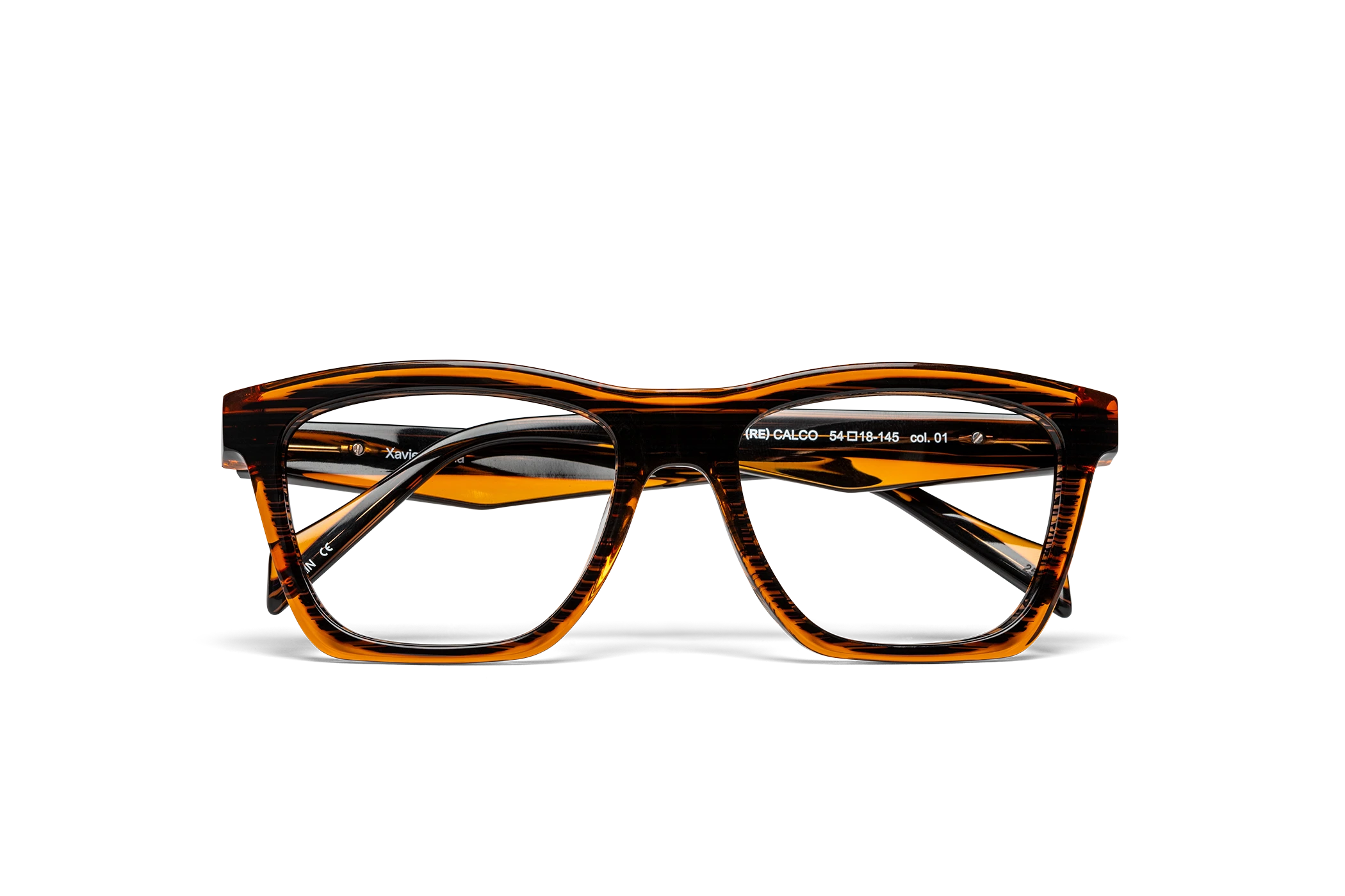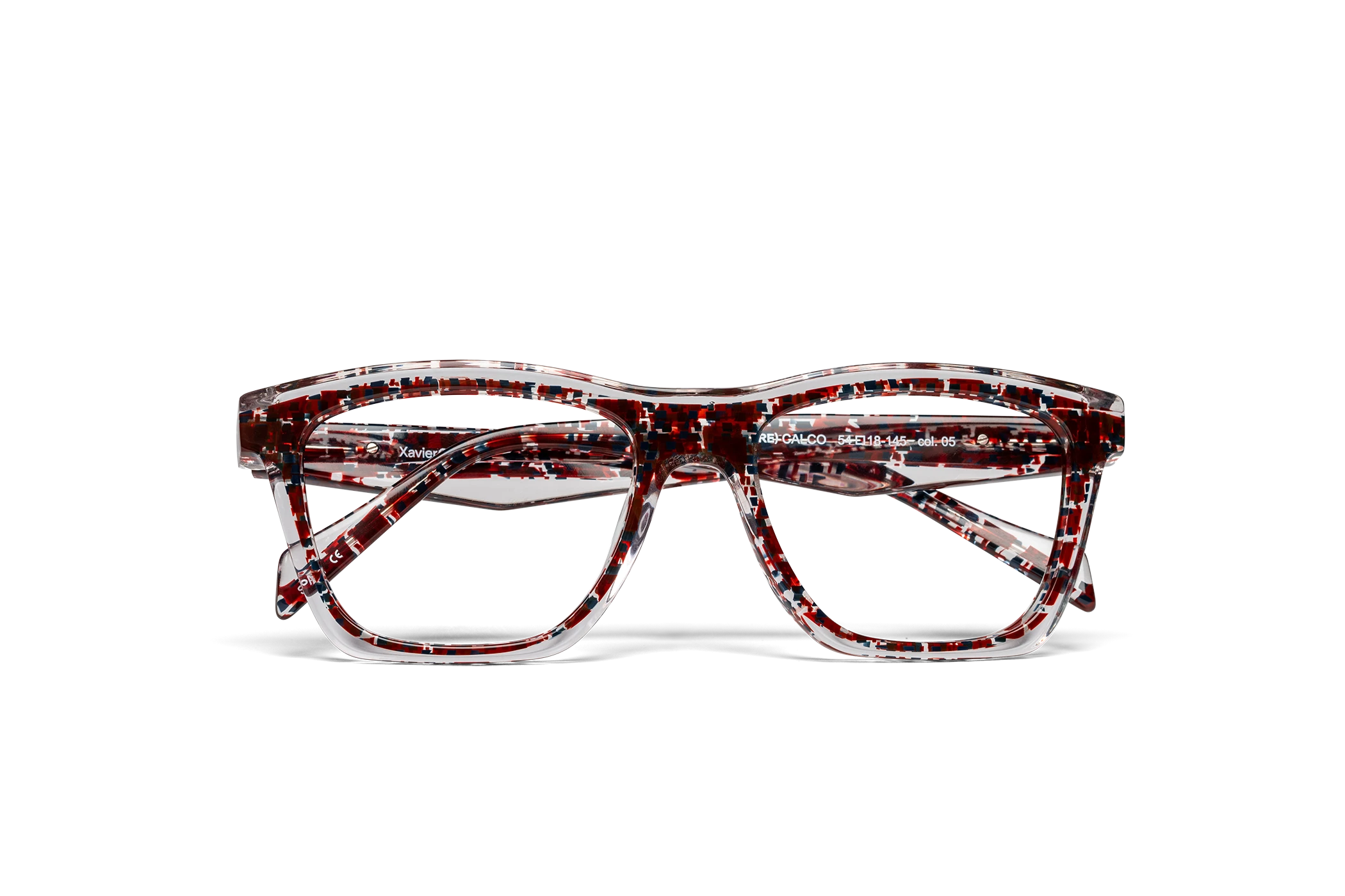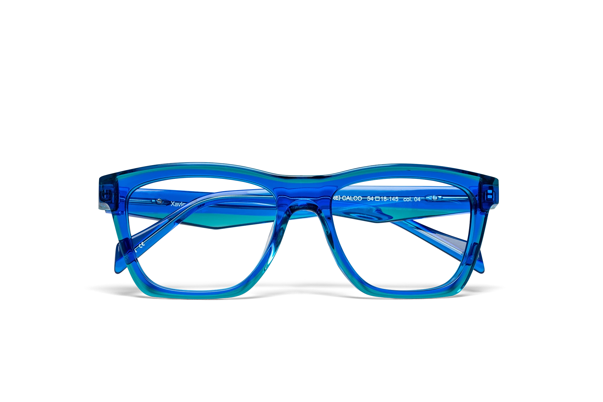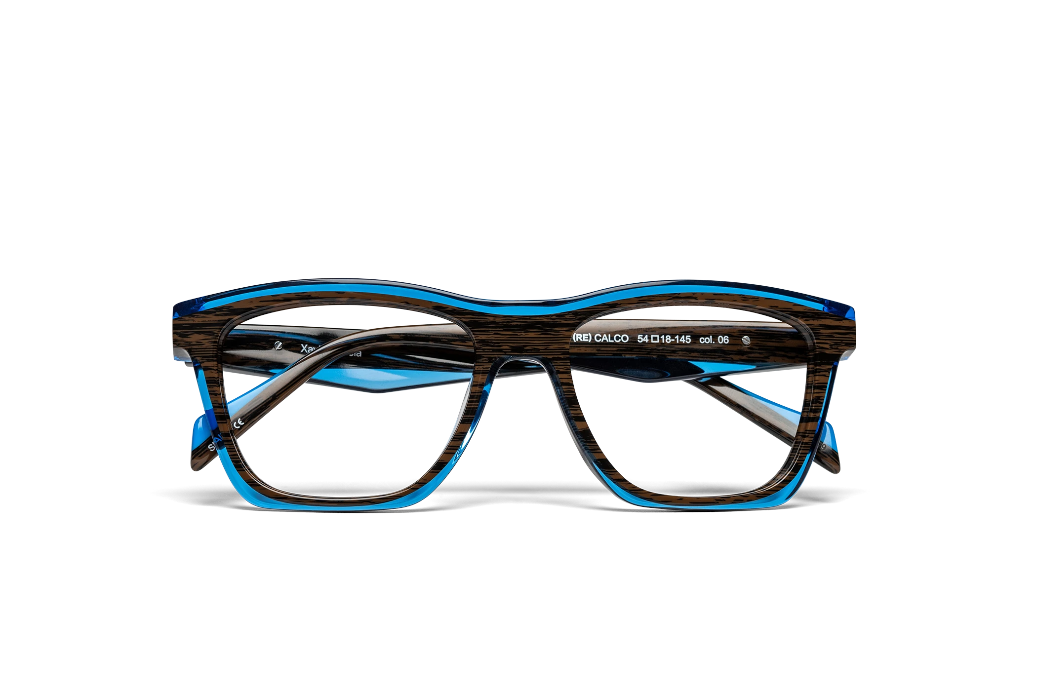 (RE)CALCO es nuestra versión de una clásica forma masculina de acetato. El laminado frontal juega con la interrelación de dos formas en una en una combinación de colores cristal que aportan luminosidad y ligereza. Flex intercambiable integrado en la varilla para un mayor confort.