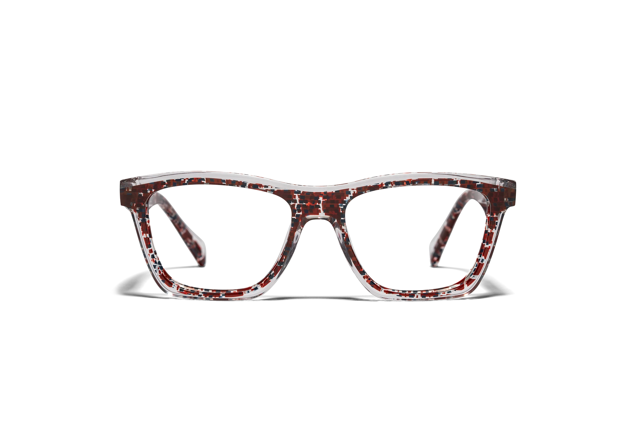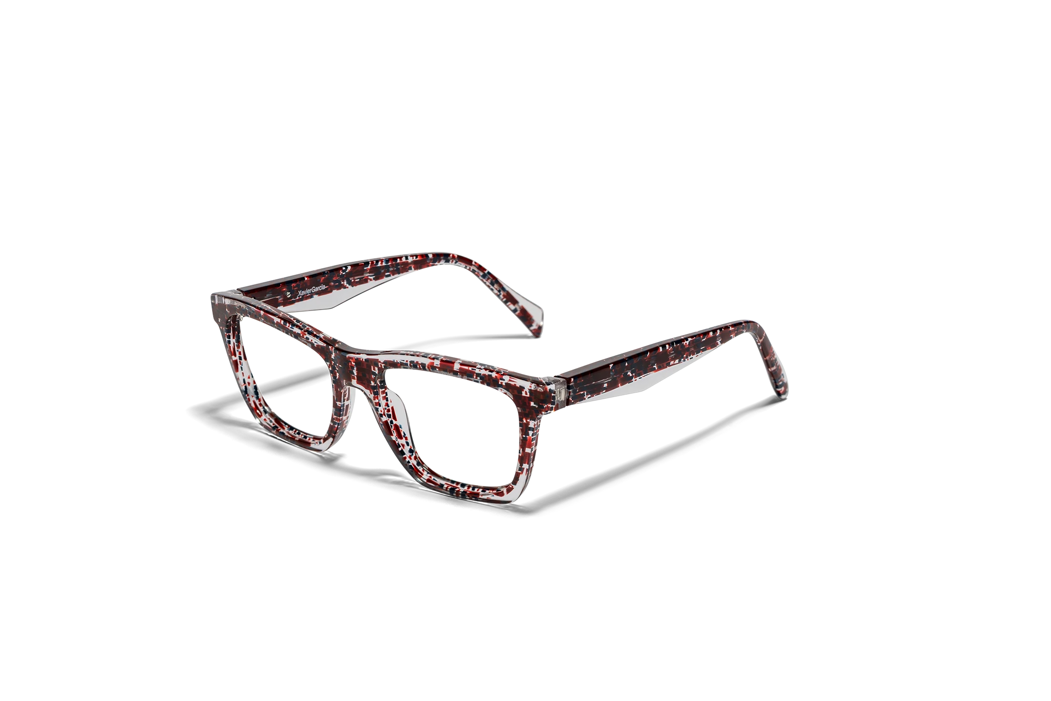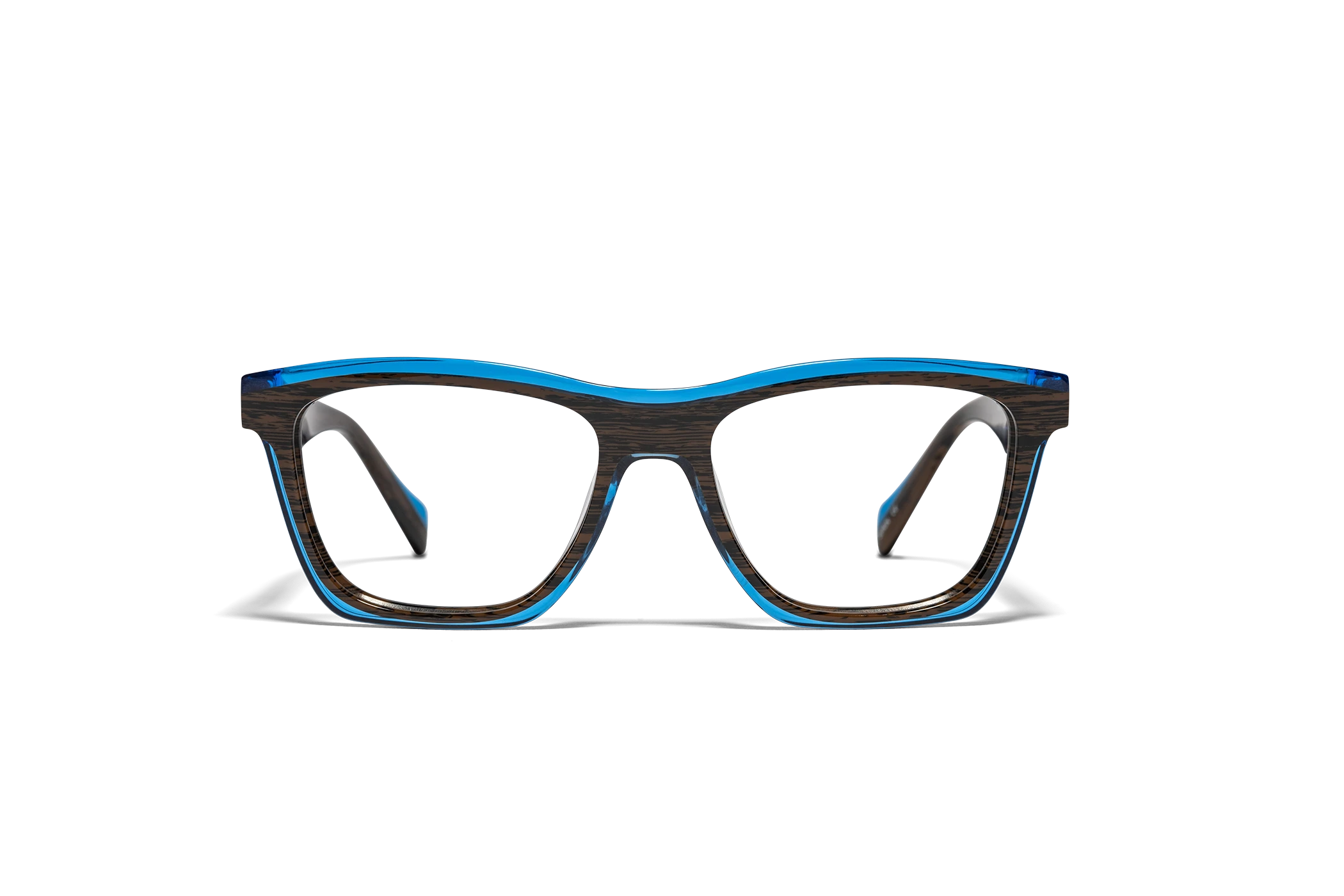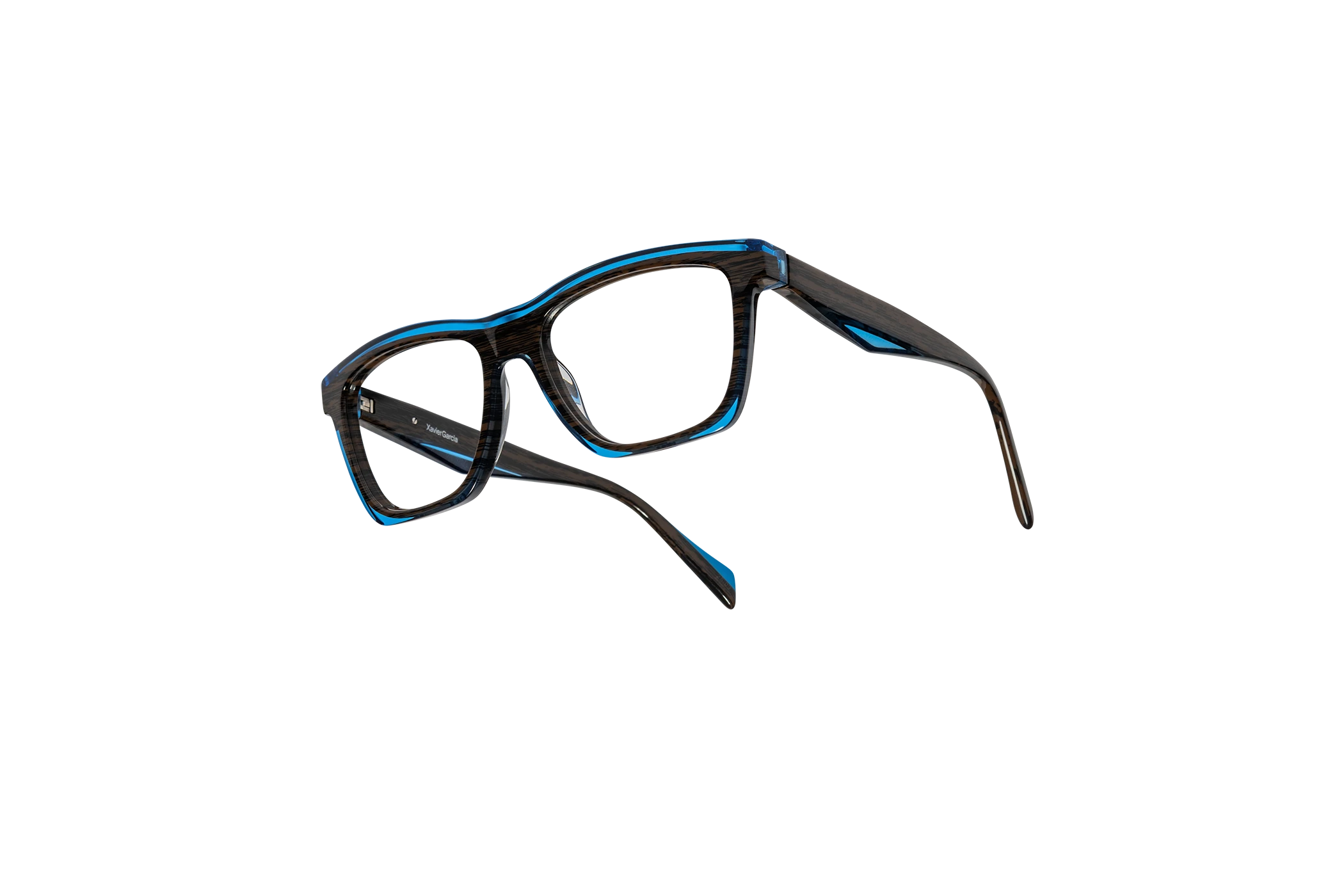 (RE)CALCO es nuestra versión de una clásica forma masculina de acetato. El laminado frontal juega con la interrelación de dos formas en una en una combinación de colores cristal que aportan luminosidad y ligereza. Flex intercambiable integrado en la varilla para un mayor confort.